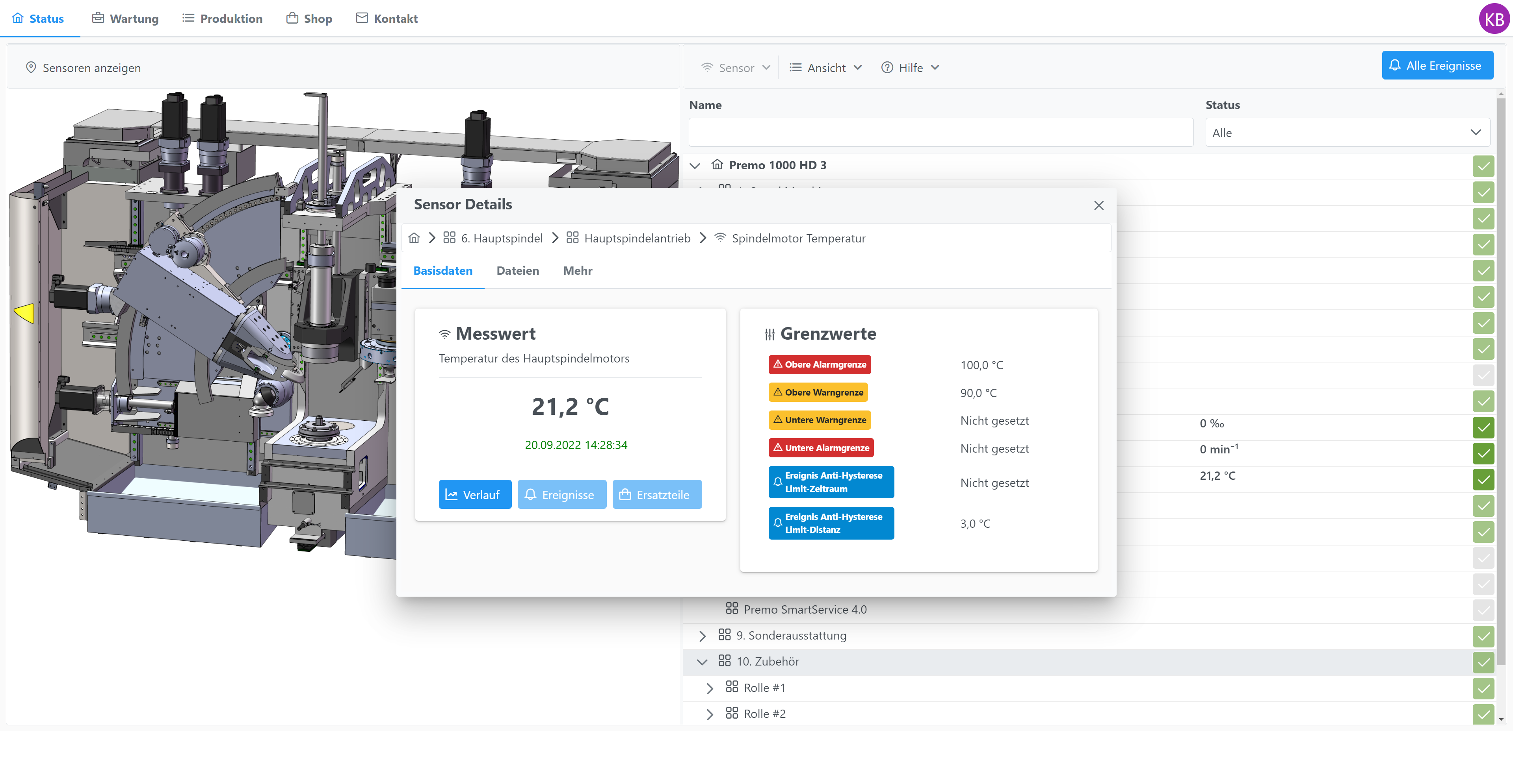 Condition monitoring is the continuous condition monitoring of machines using sensors that are installed on critical components or assemblies. Here, for example, temperatures, vibrations, power and much more are measured in order to recognise any problems occurring in the machine at an early stage and take measures in good time. PREMO SmartService 4.0 offers you the option of accessing past measurement data in real time or via the history at any time.
